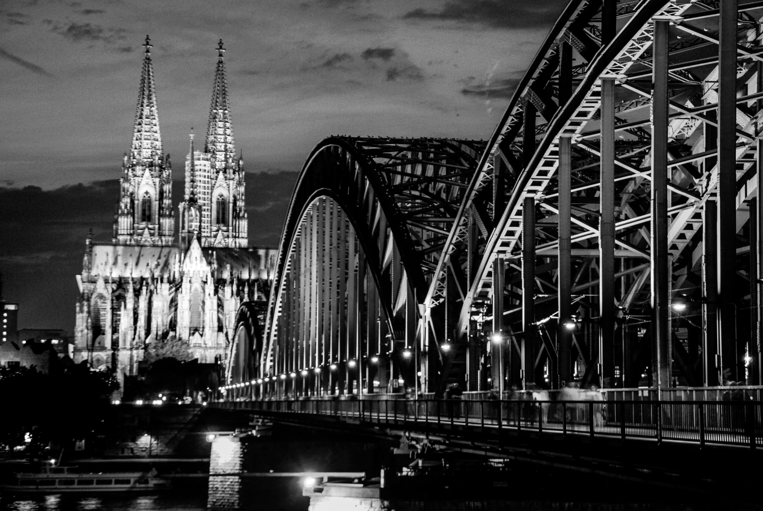 Fotografia przedstawia majestatyczną, gotycką Katedrę Kolońską, symbol wielowiekowej historii, oraz żelazny Most Hohenzollernów – przykład nowoczesnej inżynierii. To zestawienie ukazuje, jak XXI wiek czerpie z przeszłości, ale jednocześnie narzuca własne tempo i styl.